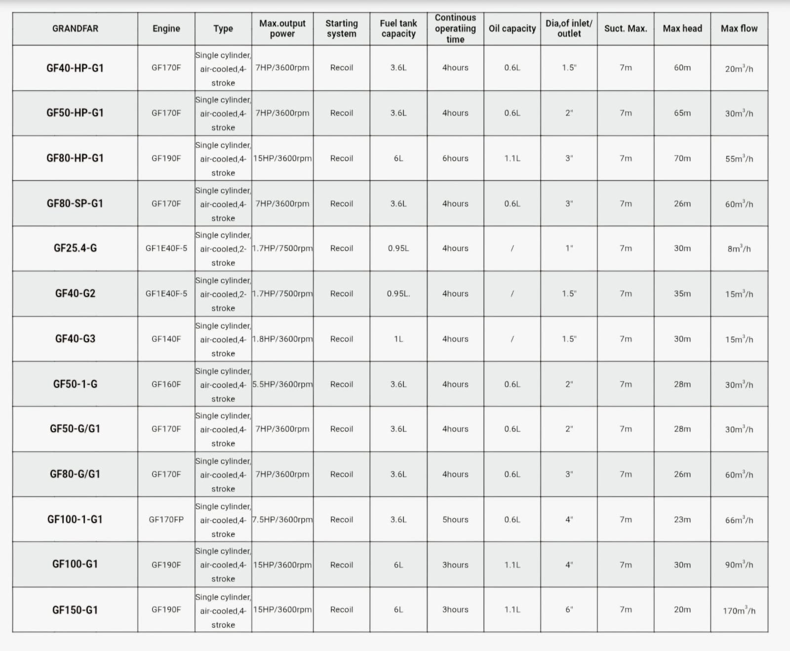 GF Seriyası, benzin su nasosu, elektrik qığılcım alovlanması ilə daxili yanma mühərrikidir, benzin yanacaq kimi istifadə olunur. Benzin mühərriki ümumiyyətlə gövdə, krank birləşdirici çubuq mexanizmi, klapan paylama sistemi, yağ təchizatı sistemi, yağlama sistemi və alovlanma sistemindən ibarət olan qarşılıqlı piston quruluşunu qəbul edir. Onlar xüsusilə məişət və ya sənaye tətbiqləri üçün uyğundur. Bu nasos çeşidi qapalı mühitdə quraşdırılmalı və ya ən azı mənfi hava şəraitindən qorunmalıdır.