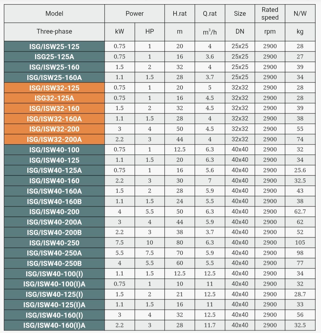 ISG şaquli mərkəzdənqaçma nasosudur. Aşındırıcı hissəciklər olmadan təmiz su və nasosun hazırlandığı materiallara görə kimyəvi cəhətdən aqressiv olmayan mayelər vurmaq üçün uyğundur. Bu seriya soyutma, istilik, dövriyyə və kondisioner sistemlərində, eləcə də yanğınsöndürmə, sənaye tətbiqlərində suyun təchizatı və daşınması üçün istifadə edilə bilər. Nasoslar qapalı mühitdə quraşdırılmalı və ya ən azı pis hava şəraitindən qorunmalıdır.