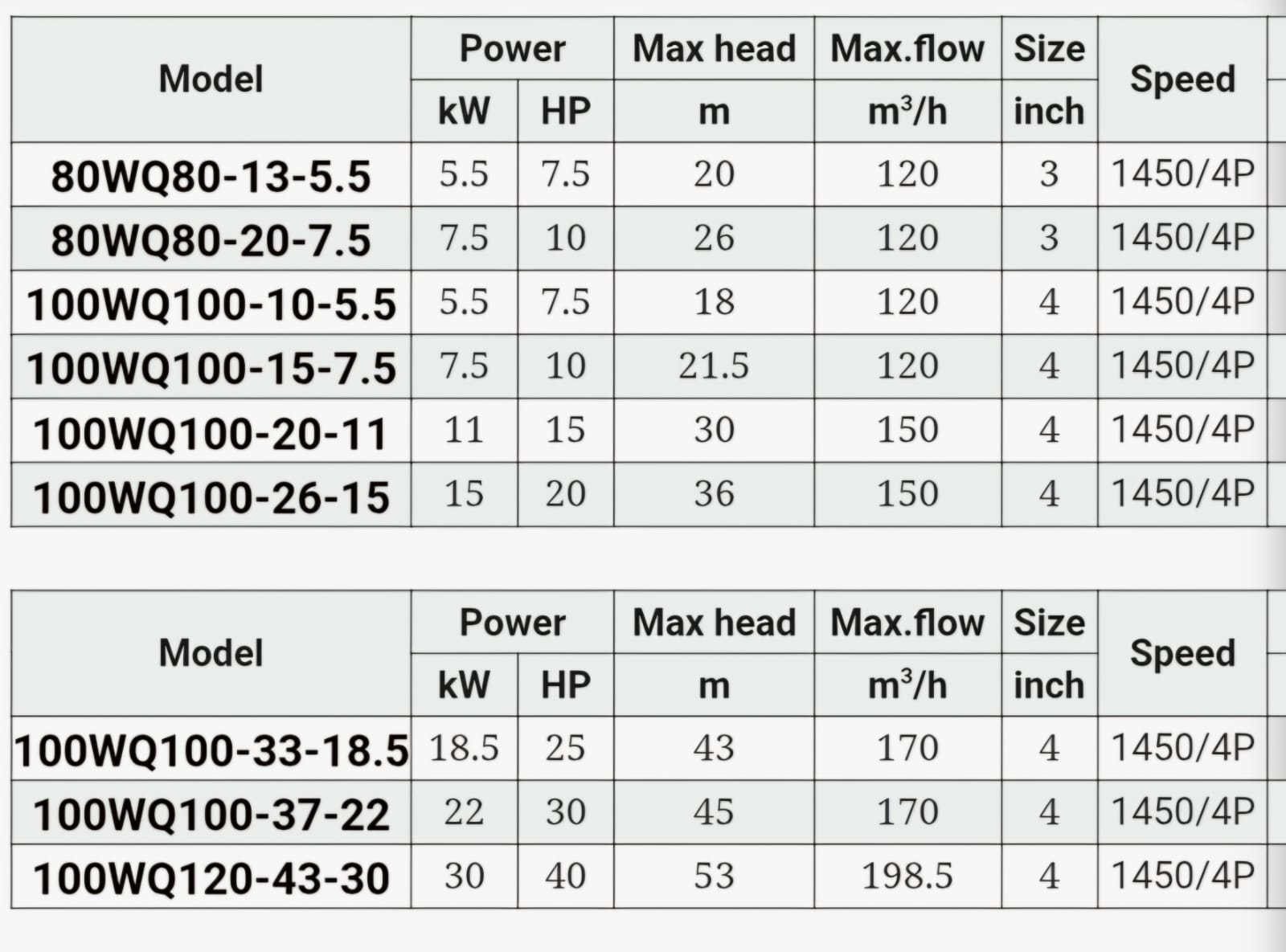 WQ seriyalı nasoslar kanal impellerləri olan əsas sualtı kanalizasiya nasoslarıdır. Avtomatik birləşdirici dəmir yolu sistemləri ilə birlikdə asanlıqla quraşdırıla bilən və ya çevik şlanq və ya flanş bağlantısı ilə müstəqil şəkildə istifadə edilə bilən geniş məhsul çeşidi mövcuddur. Əla etibarlılıq və davamlılıq sayəsində nasos işləyərkən tamamilə suya batırılmalıdır.